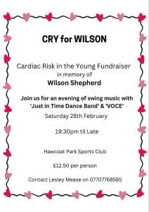 Come along and support this Charity evening, Cardiac Risk in the Young Fundraiser, in memory of Wilson Shepherd. All proceeds will be going towards local ECG screenings and saving young lives.