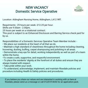 Starting with us as a Domestic Service Operative gives you an idea of how we work, how the Home runs and introduces you to our residents, working 25 hours per week whilst also making a difference.
